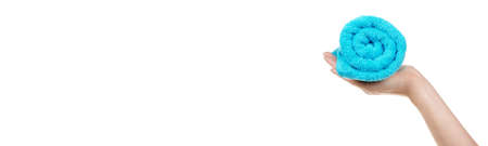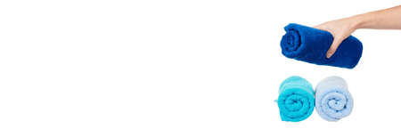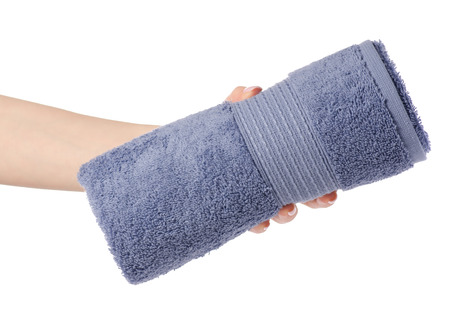 The blue gray towel roll in hand on white background isolation