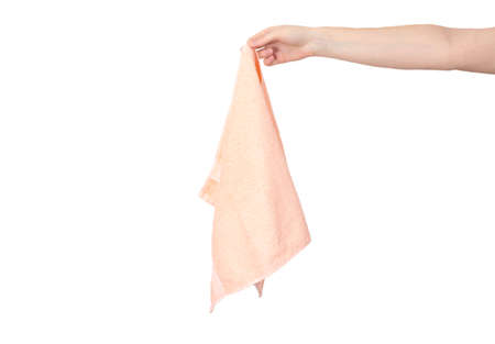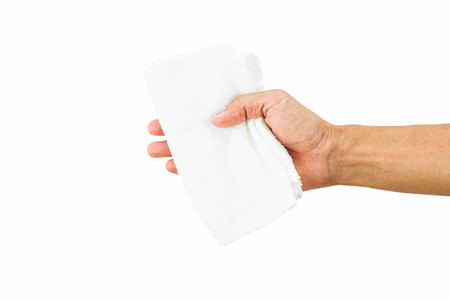 Man hand holding white towel isolated on white background