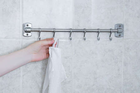 Hangs a white towel on a metal hanger in the bathroom.
