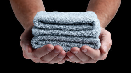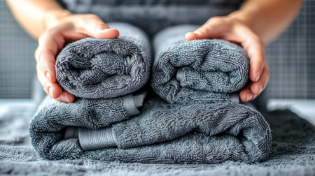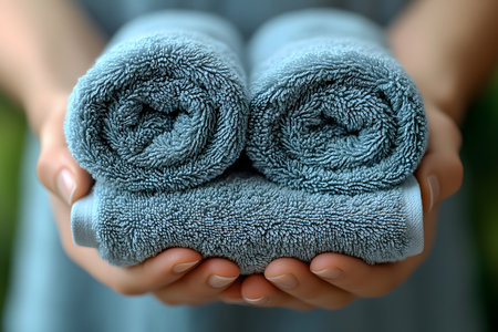 Rolled blue towels are gently cradled in hands, symbolizing relaxation and spa luxury. the soft texture and calming color evoke a sense of tranquility, ideal for wellness, beauty, and home decor themes. Generative AI
