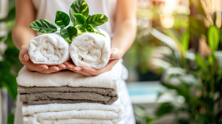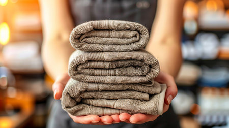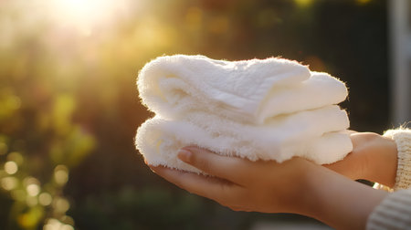 A person holds neatly stacked white towels in their hands against a softly glowing background during a relaxing moment at home. Generative AI