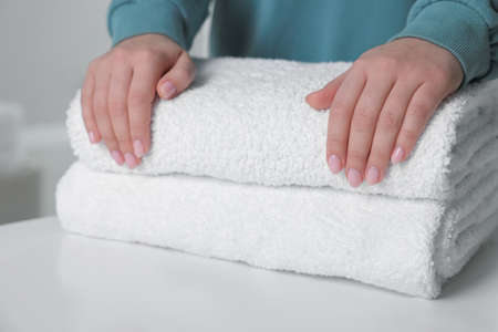 Closeup woman stack towel care hands female hygiene hotel health home white room clean