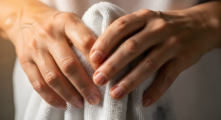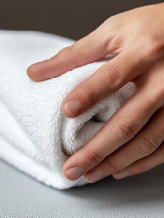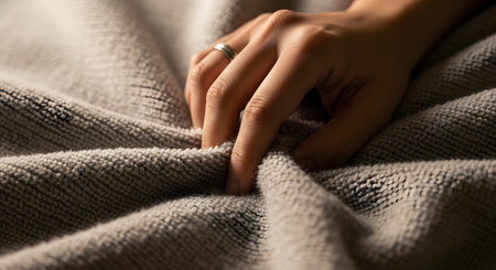 This close-up image captures a hand gently holding a soft towel, conveying warmth and comfort in a cozy indoor environment, highlighting personal care.