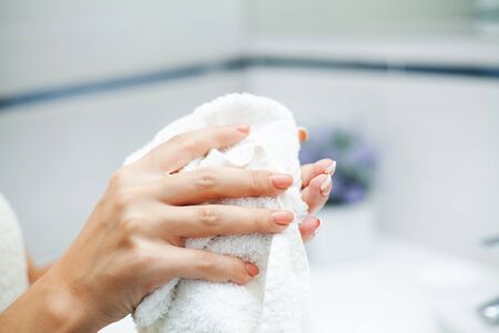 Close up hands use white towel in light bathroom.
