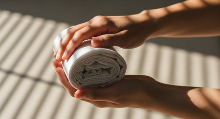 Hands stacking towel in warm light. Wellness aesthetic
