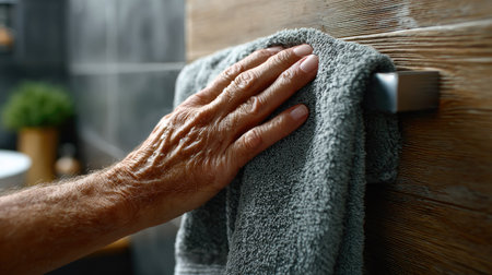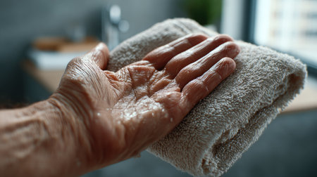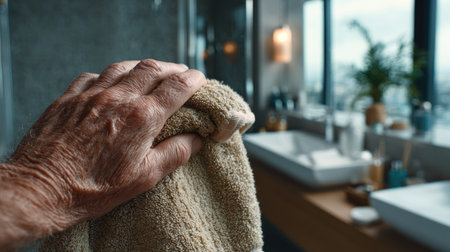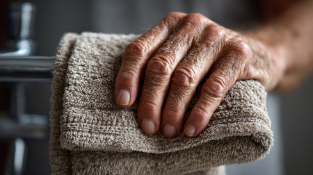 This detailed close-up features a mature hand gently resting on a soft towel in a tranquil bathroom setting, emphasizing relaxation and personal care.