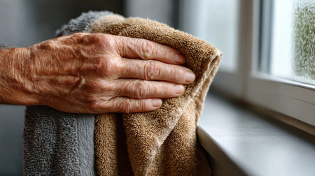 This captivating image features a senior hand gently drying a soft towel by a window, showcasing textures and a serene rainy-day atmosphere.