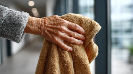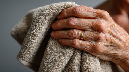 This close-up image showcases the hands of an elderly person holding a soft towel, highlighting the tenderness and care associated with daily hygiene routines.