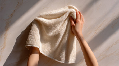 A soft hand gracefully holds a textured towel against a light marble surface, creating an inviting and serene atmosphere with gentle shadows and warm light.