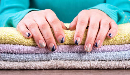 Beautiful fingers with manicure on the towel. Manicure in a beauty salon.