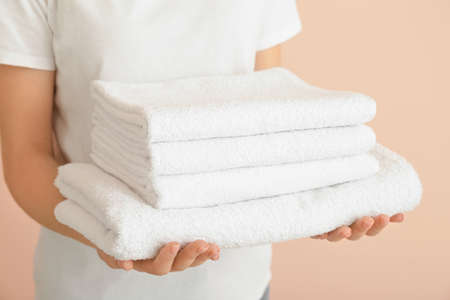 Woman with clean towels on color background, closeup