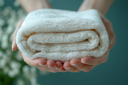 Close-up of hands gently holding a clean, soft white towel. The image emphasizes the texture of the fabric and themes of hygiene, spa comfort, and laundry freshness.
