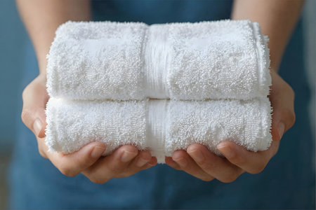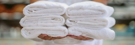 Freshly laundered white towels in close-up hands, ideal for advertising hotel services, spa treatments and premium laundry products aimed at maintaining cleanliness