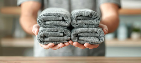 Close-up of hands holding a stack of clean,soft and fluffy white towels in a cozy home setting with a blurred,peaceful background. Representing comfort,softness and hygiene in a domestic.