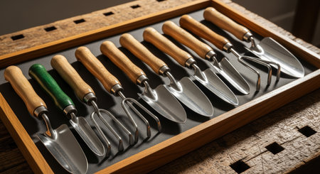 Set of ten classic gardening hand tools, including various small trowels and cultivators, with polished metal heads and wooden handles, neatly arranged in a wooden tray on a rustic workbench.