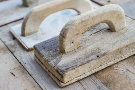 The working tool for plastering and leveling the walls lies on the finishing surface, stained with paint and putty. Background. Texture.