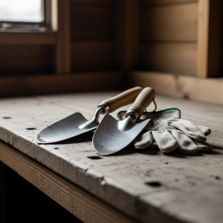 Trowel, trowel and other tools on wooden background