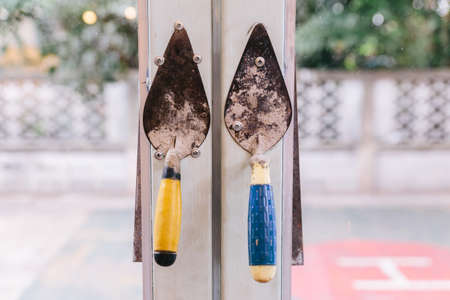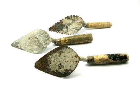 Dirty cement trowels used by bricklayers.