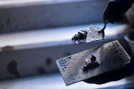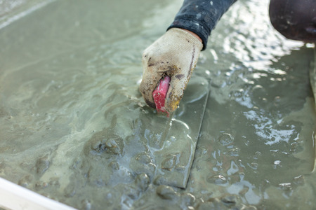 The master applies the solution to the spatula. A worker presses a spatula of adhesive mortar against the cement surface