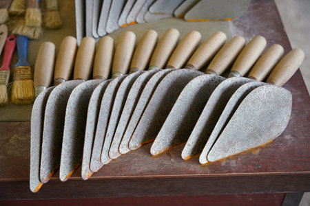 Kit of putty knives over wooden table