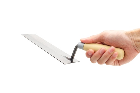 Woman hand holding a bricklayer trowel on a white background with copy space
