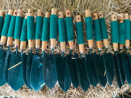 Garden trowels or Small Shovels on hay. Essential and useful in planting and potting for digging holes and breaking up clumps of soil in gardening and horticulture. Top view. Natural light.