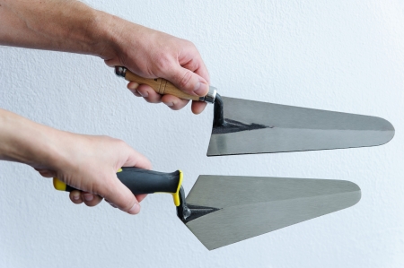 Two trowels wide and medium standing on a concrete floor against a plaster wall. Room renovation concept