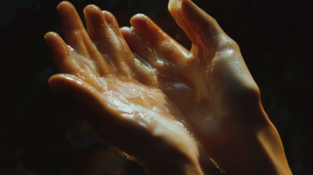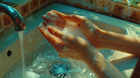 the hands of a young lady meticulously wash with soap at the sink, captured vividly in a detailed photograph that brings the moment to life