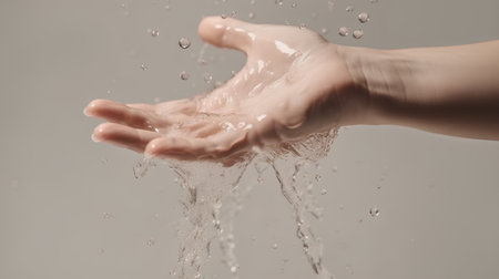 A close-up captures a person's hands as they interact with flowing water. The image reveals detailed skin texture contrasting with the water's movement. Lush greenery forms the backdrop, hinting at an outdoor setting. The composition and lighting create a sense of freshness and purity suitable for various commercial uses.