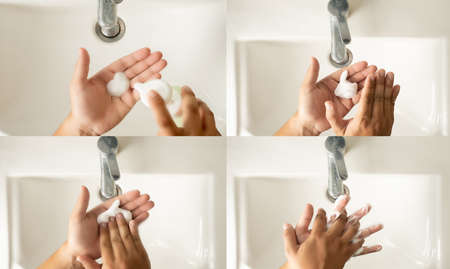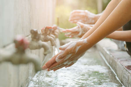 Woman washing hand with soap foam and water. Hand clean for good personal hygiene to prevent coronavirus or flu epidemic.Procedure of hand wash to kill germs, virus, bacteria. Cleaning dirty hands.