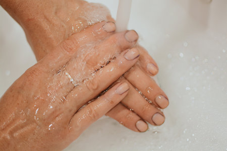 Detail closeup of young woman washing, cleaning hands, rubbing nails, fingers using soap under warm water over sink faucet, tap in bathroom. Hygiene concept, virus prevention, stop spreading bacteria