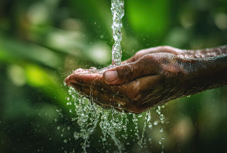 A close-up captures a person's hands as they interact with flowing water. The image reveals detailed skin texture contrasting with the water's movement. Lush greenery forms the backdrop, hinting at an outdoor setting. The composition and lighting create a sense of freshness and purity suitable for various commercial uses.