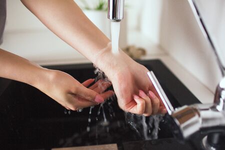 Young woman in kitchen during qiarantine. Cut view of gorl's hands holding under water jet come out of tap. Washing or warmiing up hands and wrist