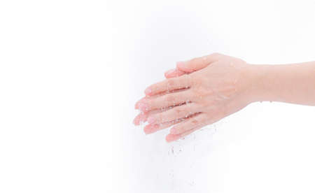Woman washing hand with water isolated on white background. Good personal hygiene concept. First step to clean dirty hands for prevent flu and coronavirus. Adult woman hand soak and wet with water.