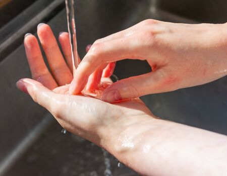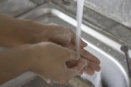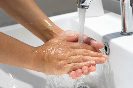 Closeup of hands of woman washing hands to protect against virus