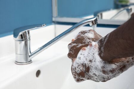 Closeup washing black man hands rubbing with soap and water in sinks to prevent outbreak coronavirus hygiene to stop spreading virus, hygiene for quarantine cleaning COVID-19 concept