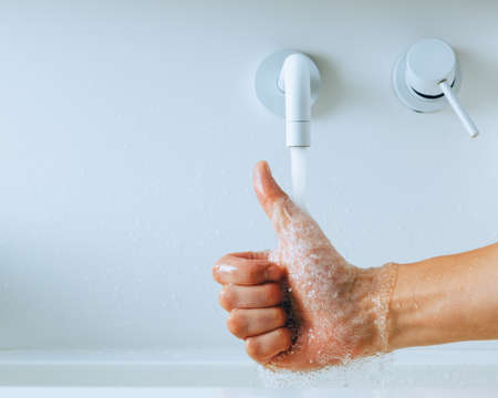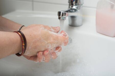 Hygiene concept. Washing hands with soap under the faucet with water