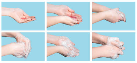 Step-by-step instructions for handwashing. Coronavirus protection. A woman washes and disinfects her hands with soap. Personal hygiene and healthcare.