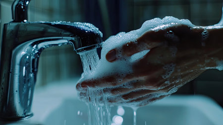 Water cascades over hands, emphasizing the importance of cleanliness and hygiene while washing in a bright, tidy environment.