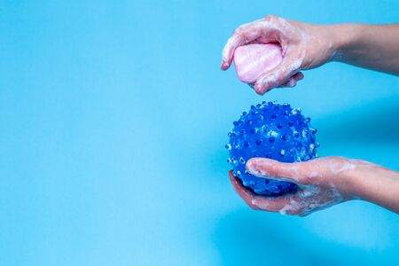 In the girl’s hands is a balloon in the form of a coronavirus which she washes with soap and water as a symbol of cleanliness and prevention against the disease. Coronovirus prevention concept. treatment
