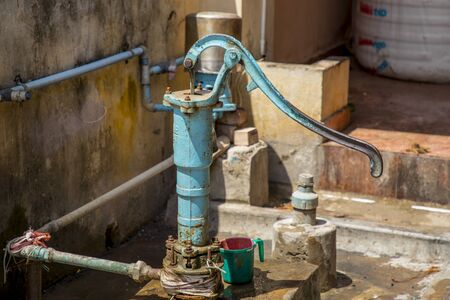 Old manual water pump. Vintage cast iron water pump with handle for pumping.