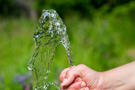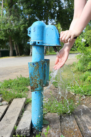 Water separating column. Water flows into the hand. Russia, free water on the street.
