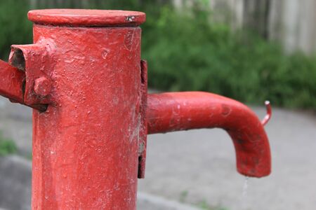 Street old and mechanical water tap. Water source in the city. Iron faucet for drinking water in a public place.