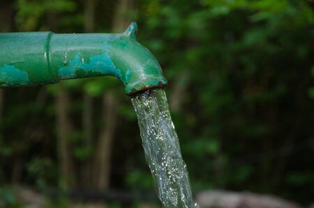 Manual old green and rusty water lever pump with water pouring out of the spout with a blurred green background
