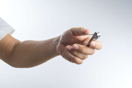 A young man does a manicure to himself. On white background. Hands. Stages of nail clipping. Close up.