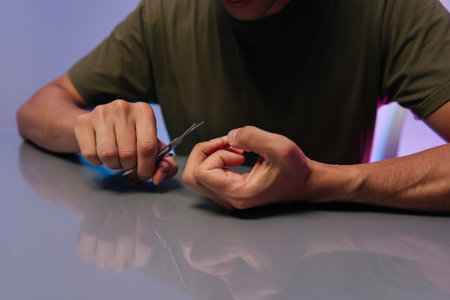 Man meticulously trimming fingernails using nail scissors, demonstrating commitment to personal hygiene and self-care practices in comfortable home setting. Concept of healthy lifestyle.