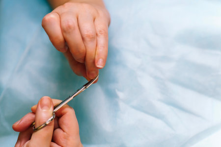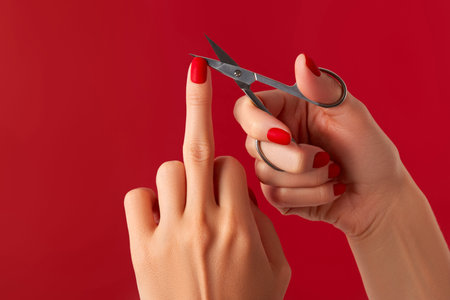 Close-up view of hands using small cuticle scissors to trim fingernails and cuticles. Clear details and vibrant colors enhance visual appeal.