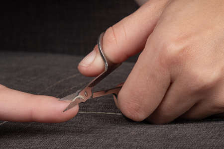 A person cuts his nails with small scissors. Men's manicure. A man cuts off a large overgrown nail