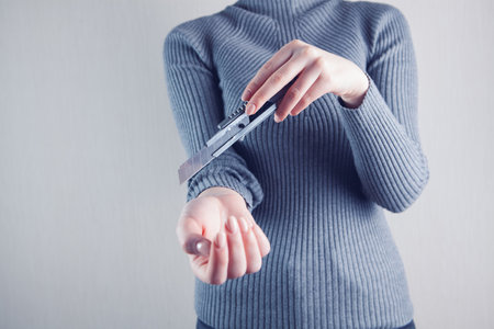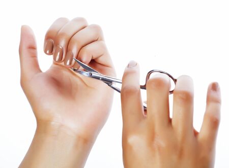 The woman is cutting her nails with small scissors by herself in close up photo on white background. View from above. Manicure at home.