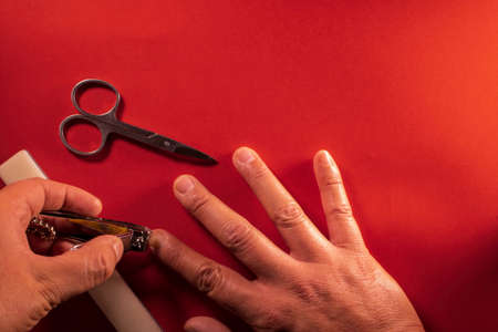 Male's hand holding on nail scissors, Man use nail scissors cutting their thumbs nail on red background